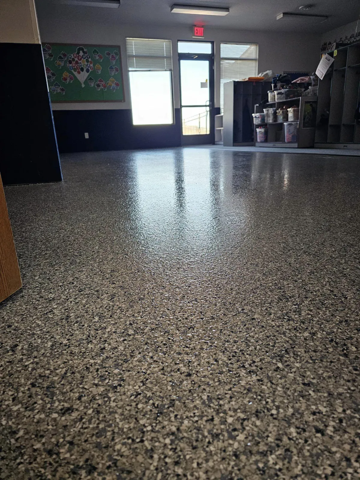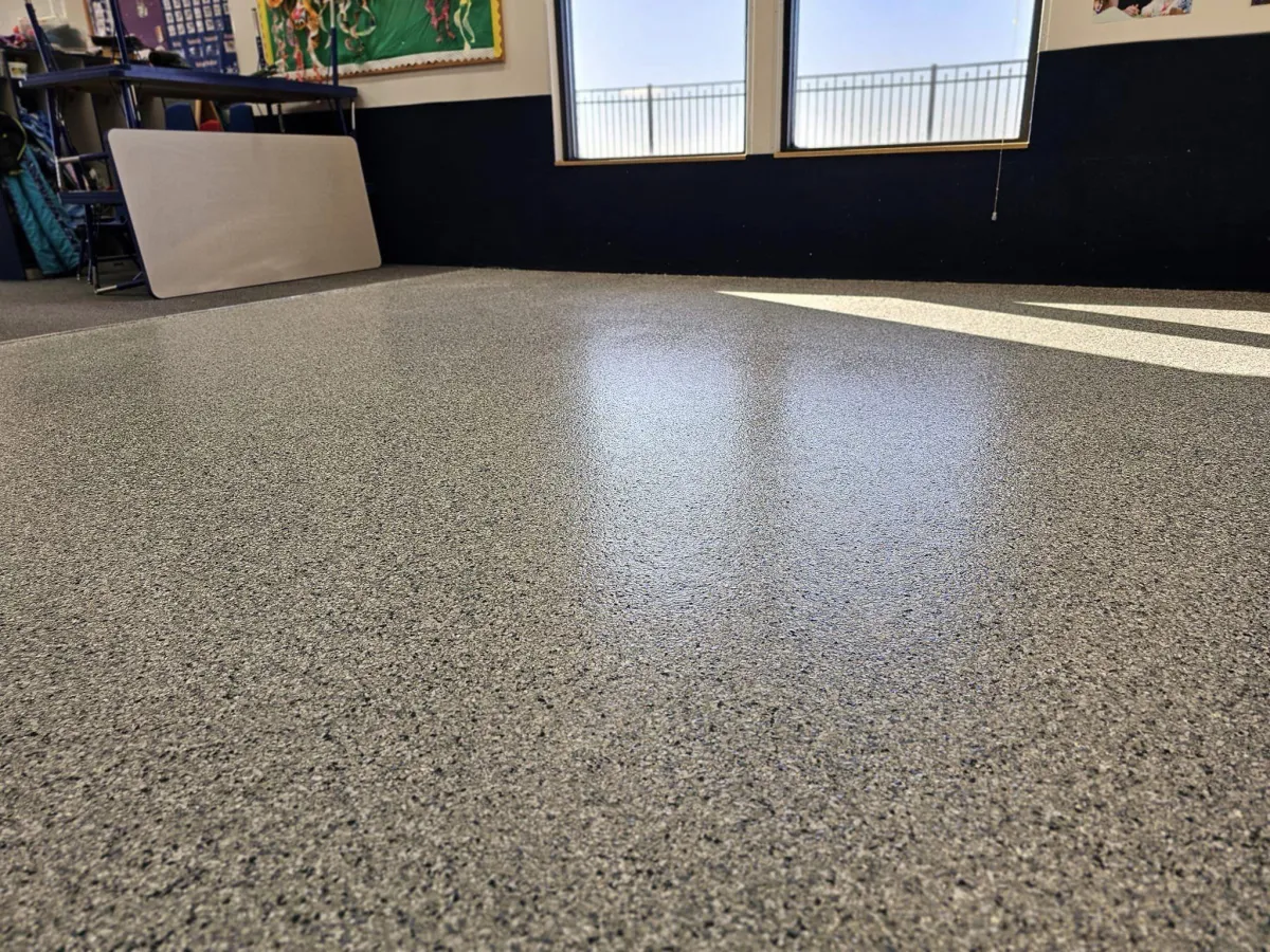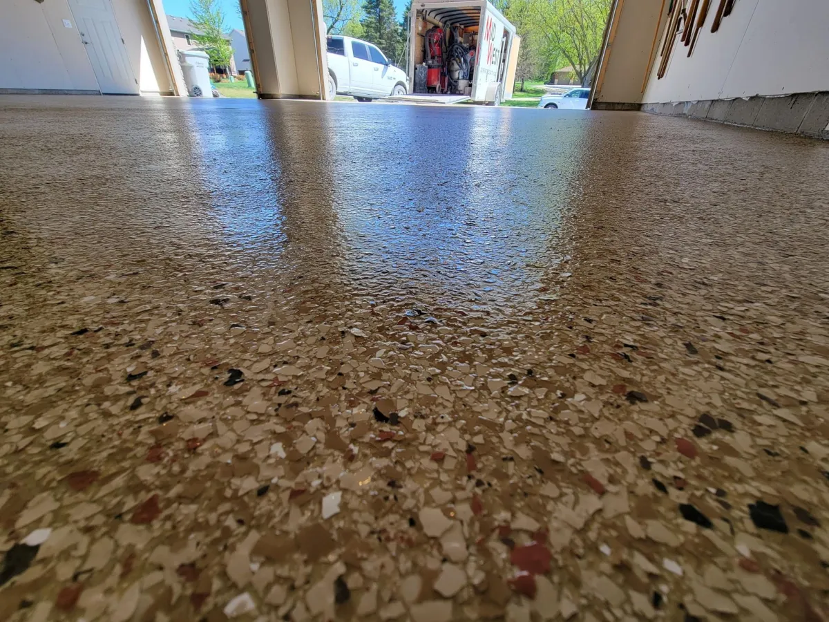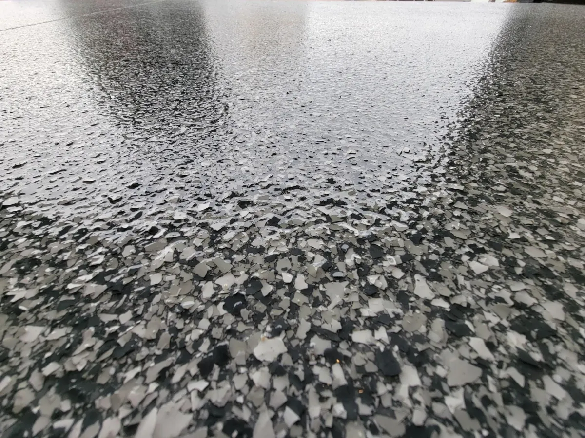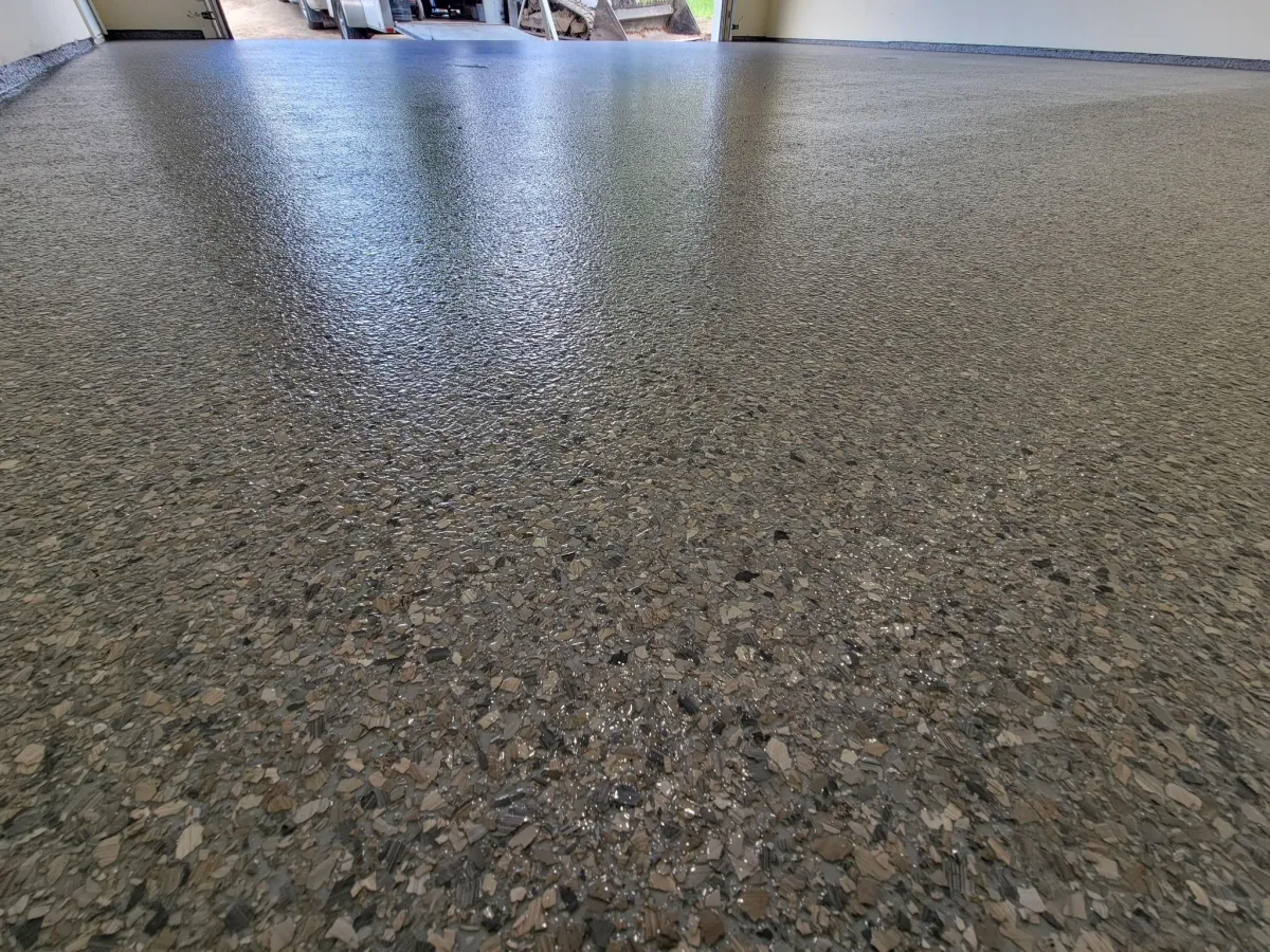 A polymer flake is generously hand broadcast providing even color & texture to the floor.